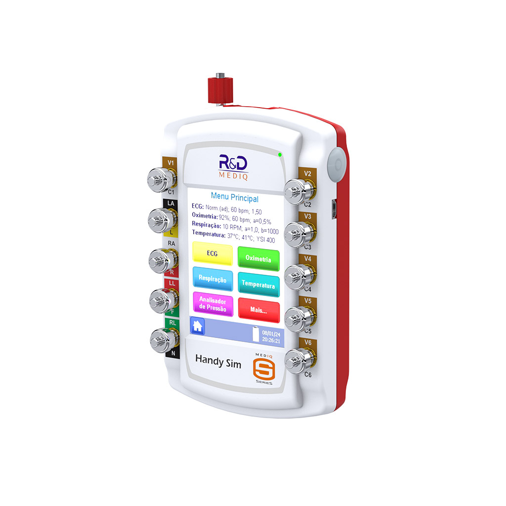 - HS-30F: Simulador de ECG ( com arritmias), oximetria, respiração e temperatura com recurso para geração de laudo e de sequência de ensaios.